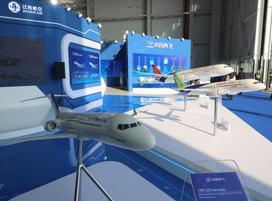室內展示區,中國商飛向公眾展示了1:20比例C919和C929基本型飛機模型,1:20比例江西航空涂裝的ARJ21飛機模型,以及1:32比例ARJ21公務(wù)機、醫療機、應急救援指揮機、滅火機、貨機,C919縮短型/高原型和加長(cháng)型系列化飛機模型。